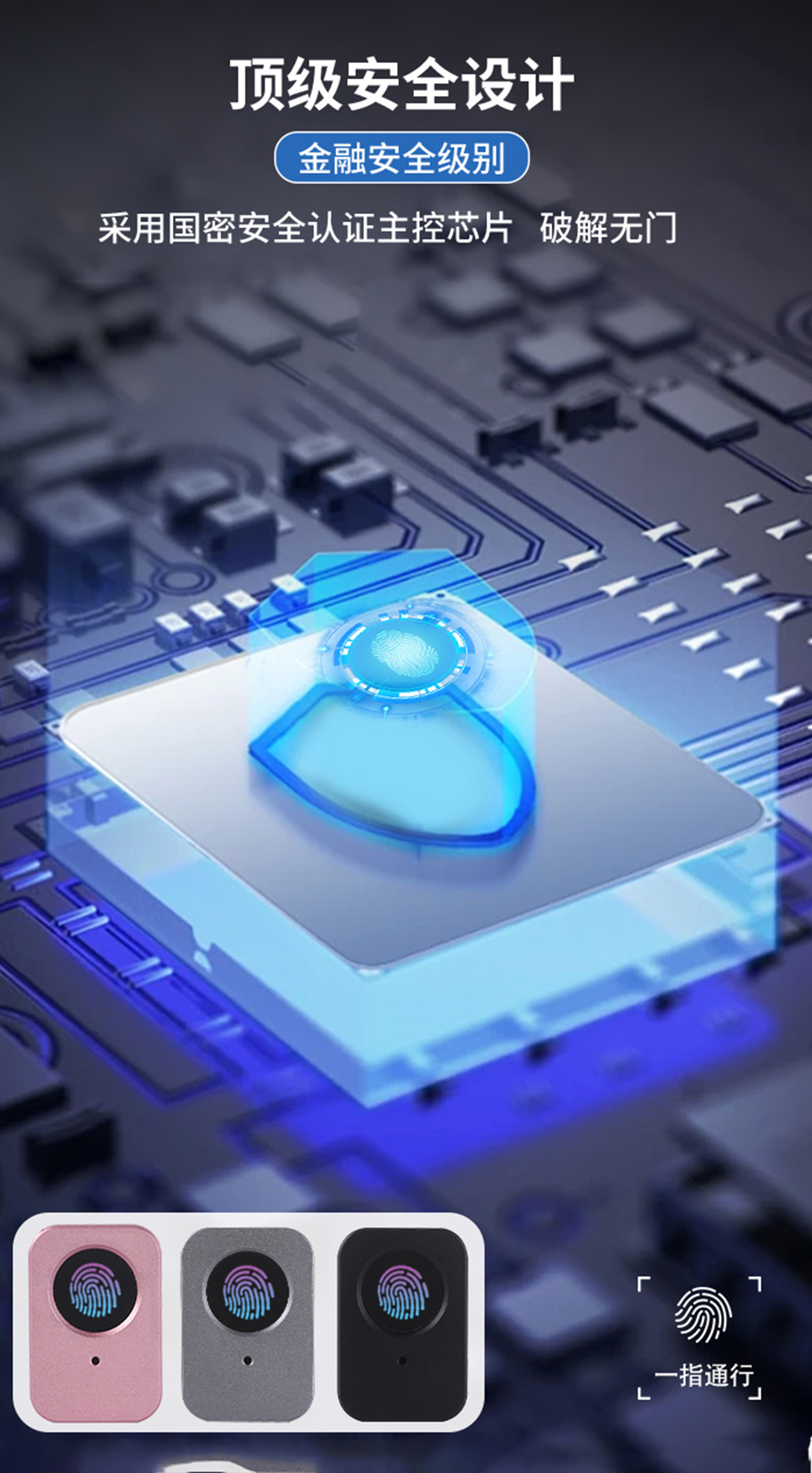 奇甲安全指纹产品的核验对比工作在安全芯片内部完成,排除了外在侵入干扰;同时,存储与主控芯片一体,采用国家密码协会授权认证的安全芯片,能达到金融安全级别,从而排除通过读取硬件数据获得账号密码。